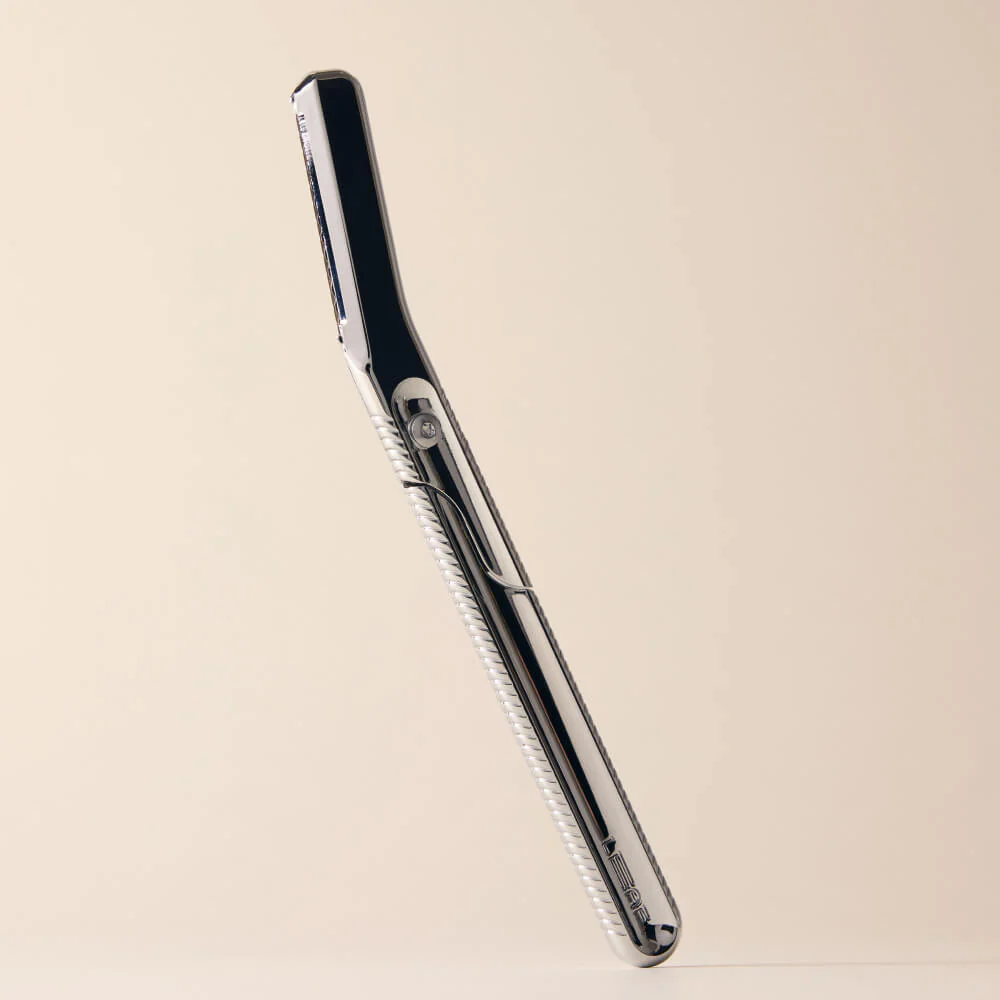 A zero-waste at-home dermaplaning facial razor for removing peach fuzz, maintaining brows, and exfoliating skin with an Earth-friendly footprint.