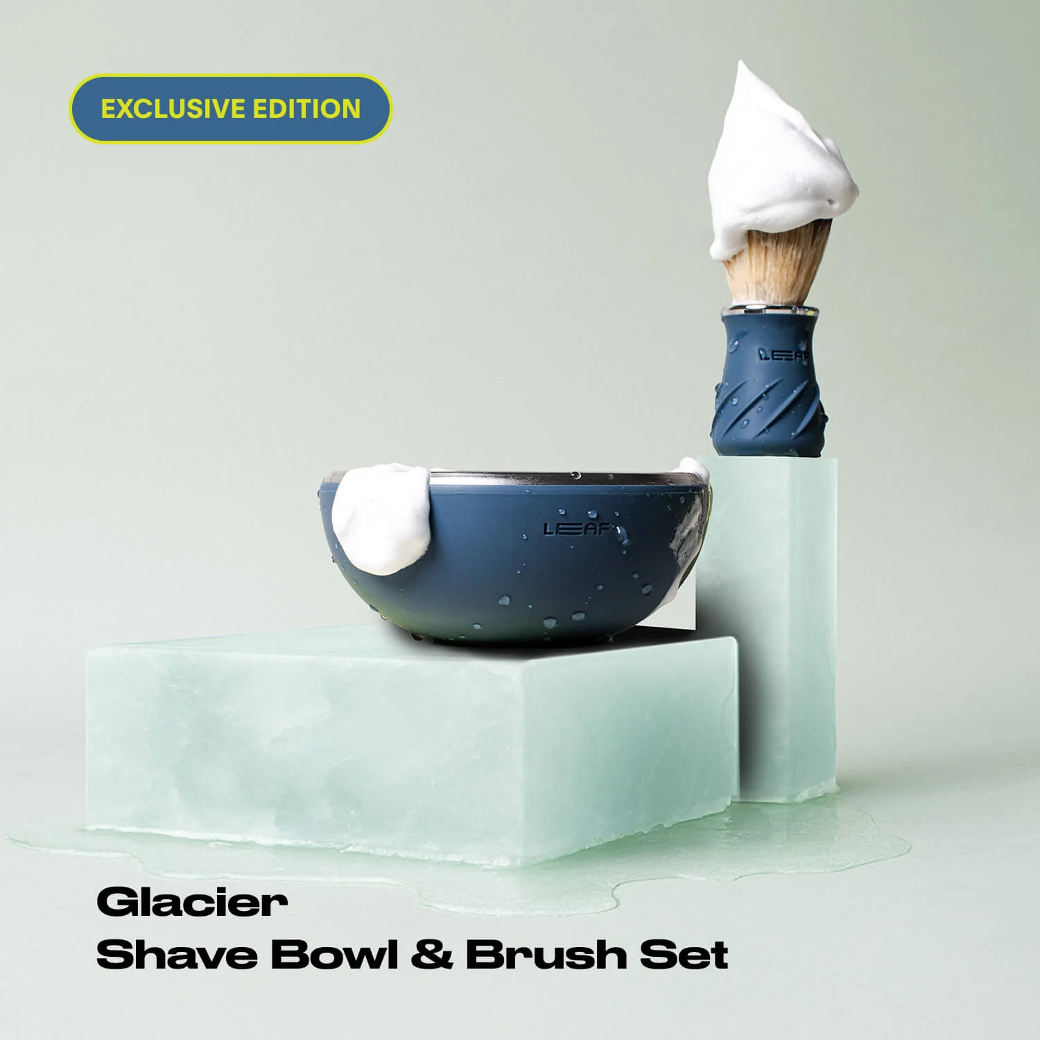 Limited gift set box featuring all-new Glacier colorway Bowl & Brush Set, seasonal scent Cider shave bar pack, and fragrance-free shave bar pack.